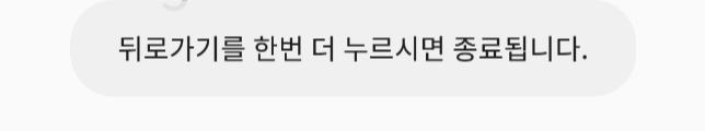 private val time = mutableListOf<Long>() class BackActivity : AppCompatActivity() { override fun onCreate(savedInstanceState: Bundle?) { super.onCreate(savedInstanceState) setContentView(R.layout.clichlistener_study1) } override fun onBackPressed() { time.add(System.currentTimeMillis()) Toast.makeText(this, "뒤로가기를 한번 더 누르시면 종료됩니다.", Toast.LENGTH_LONG).show() if (time.size >= 2) { if (time[1] - time[0] <= 2000) { super.onBackPressed() } time.clear() } }onBackPressed()는 뒤로 가기 버튼을 담당하는 메서드입니다.